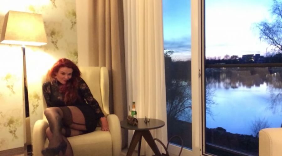 Abendstimmung am See. Die Lady genießt die Ruhe und den wunderbaren Ausblick von ihrem Luxuszimmer aus -räkelt sich im Sessel - zeigt ihre schönen wohlgeformten Beine in Nylons und Heels.... und sie gibt detailliertere Anweisungen, was sie von angehenden Geldsklaven erwartet